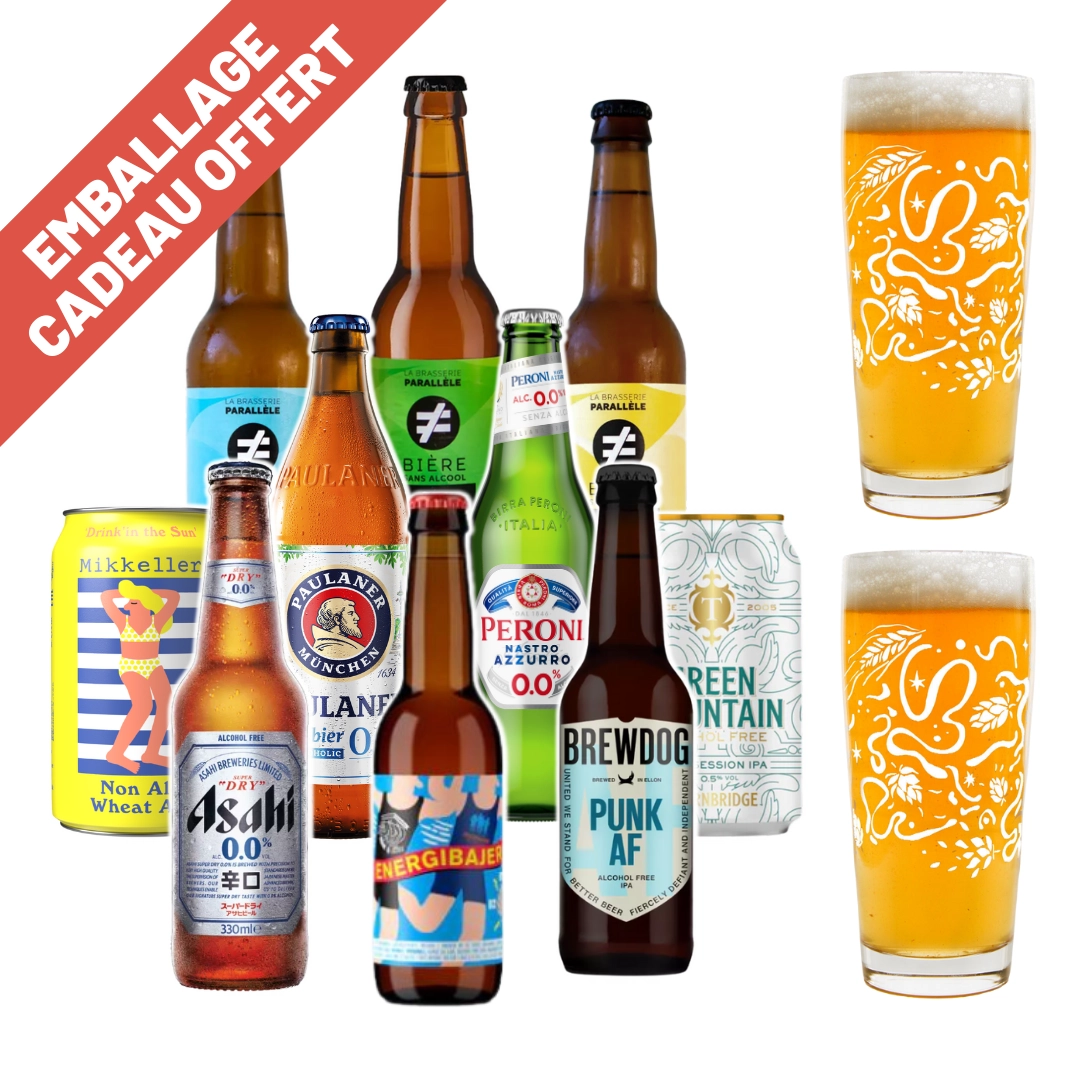 Embarquez pour un tour d'horizon à la découverte de ce qui se fait de mieux en matière de bière sans alcool avec ce coffret réunissant 10 bières, ainsi que 2 verres pour une expérience de dégustation optimale.