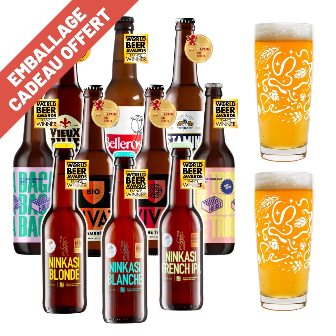 Ce coffret de bières d'exception réunit 10 bières françaises ayant récemment reçu au moins une médaille d'or dans un concours brassicole international, tel que les prestigieux World Beer Awards, le Concours International de Lyon ou encore le Berlin International Beer Competition. Blondes, triples, ambrées ou encore IPA, cet assortiment varie les couleurs et les styles, pour vous donner un panorama le plus complet possible de ces bières qui portent haut et fort les couleurs de la scène brassicole française 🇫🇷